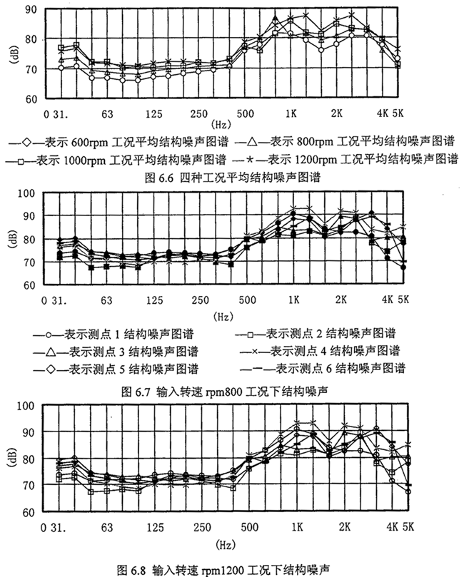 (5)從圖6.9空氣噪聲倍頻程圖譜可以看出,隨著轉(zhuǎn)速升高在小于1000Hz時(shí)空氣噪聲倍頻程幅值變化不大,但大于1000Hz至5000Hz時(shí)變化較明顯,這與減速器的嚙合頻率或嚙合頻率倍數(shù)成份上的振動(dòng)幅值較大有很大關(guān)系。
