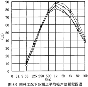 圖6.9為四種工況平均空氣噪聲倍頻程圖譜。由于減速齒輪裝置只是整個(gè)試驗(yàn)系統(tǒng)的一部分,在測(cè)試時(shí),發(fā)聲系統(tǒng)除齒輪箱外,還包括電動(dòng)機(jī)、風(fēng)機(jī)及車(chē)間內(nèi)其它相鄰設(shè)備等背景噪聲源,它們將影響減速齒輪裝置的噪聲測(cè)量結(jié)果?紤]這些影響,根據(jù)國(guó)家標(biāo)準(zhǔn)《齒輪裝置噪聲聲功率級(jí)測(cè)定方法》(GB6404-1986)的規(guī)定,按各測(cè)點(diǎn)上測(cè)得的1/1倍頻程聲壓級(jí)做對(duì)數(shù)平均,然后進(jìn)行修正,以得到實(shí)際的1/1倍頻程聲壓級(jí)空氣噪聲值。圖6.9為修正后的齒輪減速裝置的倍頻程平均空氣噪聲圖譜。表3為各測(cè)點(diǎn)A 聲級(jí)空氣噪聲值