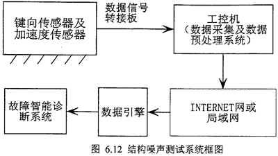 實(shí)驗(yàn)裝置共有兩大部分,一部分是實(shí)時(shí)監(jiān)測(cè)及數(shù)據(jù)采集,一部分是信號(hào)分析處理系統(tǒng)。其測(cè)試系統(tǒng)框圖如圖6.12所示。