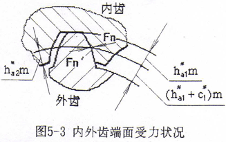 一般鼓形齒聯(lián)軸器的齒頂高系數(shù)ha1*=1,徑向間隙系數(shù)c1*=0.25,全齒高h=2.25m,采用標準齒輪,其內(nèi)外齒輪分度圓齒厚大致相等。它的主要優(yōu)點是內(nèi)外齒輪加工工藝性好,可采用標準齒輪滾刀和插齒刀進行加工,且尺寸計算簡單。但是這種鼓形齒聯(lián)軸器的外齒輪齒根抗彎強度比內(nèi)齒輪齒根抗彎強度要低,即內(nèi)齒輪齒根彎曲強度有富余。因此,可設(shè)法增加外齒輪齒厚,提高外齒輪齒根彎曲強度。通常采用兩種方法:一是采用特殊刀具減簿內(nèi)齒輪齒厚而增加外齒輪齒厚,使內(nèi)外齒輪的抗彎強度接近一致;另一種方法是采用變位短厚齒型內(nèi)外齒輪,降低外齒輪齒高,加大外齒輪齒厚,使其粗短,以提高外齒輪的抗彎強度[75]。前一種方法需采用專用的瘦齒型滾刀,這給加工帶來不少麻煩,因此在國內(nèi)不宜推廣。文獻[75]所出了一種變位短厚齒型鼓形齒聯(lián)軸器的設(shè)計制造方法,由于是采用標準滾刀和插齒刀進行加工,加工方法簡單易行,因此工藝性好,生產(chǎn)效率高,是一種較理想的適宜推廣應(yīng)用的設(shè)計加工方法。但是,該文提出采用齒頂高系數(shù)ha1*=0.8不一定合理,因為齒頂高系數(shù)的確定一方面要使內(nèi)外齒輪齒根彎曲強度一致,另一方面又要使內(nèi)外齒輪齒面具有足夠的接觸強度及內(nèi)齒輪齒頂厚應(yīng)大于0.25m。因此必須建立優(yōu)化數(shù)學(xué)模型進行計算來確定。將內(nèi)外齒輪輪齒簡化成懸臂梁受力(如圖5-3所示)[127],本問題是要使內(nèi)外齒輪齒根有接近的齒根彎曲強度,則目標函數(shù)為