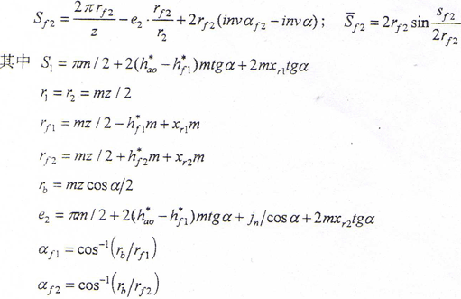 設(shè)齒形角α=20°,頂隙系數(shù)c1*=0.25,模數(shù)齒數(shù)為給定值,根據(jù)這種短厚齒的加工原理是減少滾刀的切入量,使其齒高系數(shù)減小,這也相當(dāng)于使用齒厚減簿的滾刀來滾切鼓形外齒輪,即相當(dāng)于采用了切向變位加大齒厚。其切向變位系數(shù)xτ1與齒高系數(shù)的關(guān)系為xτ1=2(hao*-hf1*)tgα,式中hao*為滾刀的齒頂高系數(shù),通常hao*=1.25,hf1*為被切外齒輪齒根高系數(shù),hf1*=ha1*+c1*。為了滿足聯(lián)軸器軸間傾角的要求,除外齒輪有一定的鼓度外,內(nèi)外齒之間還應(yīng)有一定的齒間側(cè)隙jn,此側(cè)隙可按一定的原則分配到內(nèi)外齒輪齒厚上,使它們有相應(yīng)的減簿量?紤]加工的因素及總的要求是減簿內(nèi)齒輪齒厚、增大外齒齒厚,因此將jn全部分配在內(nèi)齒輪上,則內(nèi)齒輪切向變位系數(shù)