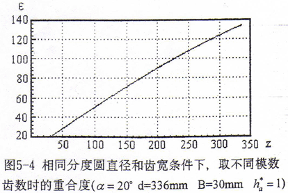 鼓形齒聯(lián)軸器的齒數(shù)模數(shù)決定了其徑向結(jié)構(gòu)尺寸大小。對于優(yōu)化鼓度曲線的鼓形齒聯(lián)軸器,其嚙合特性與共軛齒面鼓形齒聯(lián)軸器相近,因此我們可以依據(jù)共軛齒面鼓形齒聯(lián)軸器特性來考慮齒數(shù)模數(shù)的參數(shù)優(yōu)化問題。圖5-4給出了相同齒輪分度圓直徑和齒寬條件下取不同模數(shù)齒數(shù)時的重合度曲線,從曲線可以看出相同齒輪分度圓直徑和齒寬條件下,所取齒數(shù)越多,則重合度越大。重合度越大,平均每對齒承受的載荷越小,多齒嚙合過渡狀態(tài)載荷分配的變化量越小,傳動越平穩(wěn)。因此總的模數(shù)齒數(shù)的選取原則是盡可能選大的齒數(shù)。但是相同齒輪分度圓直徑條件下,齒數(shù)越大,模數(shù)越小。模數(shù)的減小將降低齒根彎曲強度;另外,由齒面接觸線形態(tài)知,模數(shù)的減小也將降低齒面接觸強度。為保證有足夠的齒根彎曲強度和齒面接觸強度,應(yīng)由所傳遞的轉(zhuǎn)矩和許用應(yīng)力值,先計算出所允許的最小模數(shù),再根據(jù)這個模數(shù)值及分度圓直徑來確定齒數(shù)。由于使用中磨損是不可避免的,因此,選取模數(shù)時還應(yīng)考慮輪齒齒厚有一定的裕量,保證在一定的磨損程度下仍有足夠的強度。另外,模數(shù)的選取還應(yīng)考慮工藝條件的許可。這些內(nèi)容包含較多的經(jīng)驗成份,在此不予詳細討論。