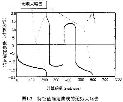 Pilkey和Leckie開發(fā)的用于分析帶分支系統(tǒng)扭振系統(tǒng)的傳遞矩陣法包括將分支系統(tǒng)簡化為一個等效單轉(zhuǎn)子系統(tǒng)。這種方法要求將分支系統(tǒng)的參數(shù)累加在分支系統(tǒng)所屬的軸段上。因為這種方法要求從主傳遞矩陣上消去分支系統(tǒng)的狀態(tài)關(guān)系,這會導(dǎo)致用根搜索法求解時丟到合理的根。如下圖1-2所示的一個頻率范圍內(nèi)的分支系統(tǒng)的特征曲線,因為無限大而略去的特點會導(dǎo)致丟根。