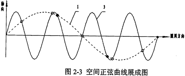 圓柱正弦活齒傳動在工作過程中,幾乎每個活齒都同時參與嚙合,活齒安裝在主動軸與殼體正弦滾道的交叉點處,活齒的安裝位置限制了活齒的數(shù)目n。將空間正弦曲線沿圓柱直母線方向展成平面正弦曲線,如圖2-3所示,其中1線為主動軸正弦滾道曲線,3線為殼體正弦滾道曲線。設(shè)正弦曲線切線的斜率有正負(fù)之分,則兩條正弦曲線相交,交點可以分為兩類:一類交點指在交點處兩正弦曲線的切線斜率同號(如圖中黑點所示);二類交點指在交點處兩正弦曲線的切線斜率異號(如圖中白圈所示)。若要求圓柱正弦活齒傳動的輸入輸出為同向傳動時,活齒應(yīng)安放在二類交點處,此時活齒的個數(shù)為n=Z1+Z3;若輸入、輸出為反向傳動時,活齒應(yīng)安放在一類交點處,此時活齒的個數(shù)為n=|Z1-Z3|。并保證,n≥3。