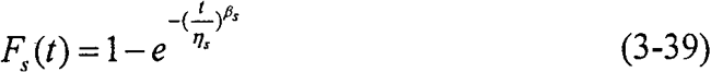 根據(jù)故障樹對圓柱正弦活齒減速器進(jìn)行可靠性的數(shù)字仿真研究。各基本部件壽命分布參數(shù)見表3-5,采用上述算法編程求解。通掃故障樹5000次,產(chǎn)生減速器壽命抽樣值5000個,設(shè)系統(tǒng)最大工作時間Tmax為1000Oh,將Tmax分為1000個區(qū)間,統(tǒng)計減速器壽命抽樣落入各區(qū)間的次數(shù),得到系統(tǒng)平均壽命,即減速器平均無故障工作時間MTBF為3086h,壽命的方差為6.39×106。根據(jù)仿真結(jié)果進(jìn)行擬合分析,系統(tǒng)壽命服從威布爾分布,即