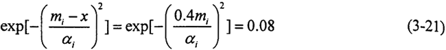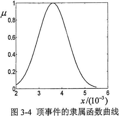 故障樹中各事件發(fā)生的概率用模糊數(shù)來表示,根據(jù)模糊數(shù)的運算法則式(3-13)、(3-15)和模糊算子AND和OR的計算方法式(3-18)、(3-20)即可確定頂事件發(fā)生的模糊概率。假定事件發(fā)生概率Pi的參照函數(shù)為正態(tài)對稱型,其隸屬函數(shù)如式(3-11)所示,且與均值mi相差±40%的點x的隸屬度為0.08,則