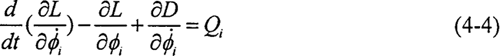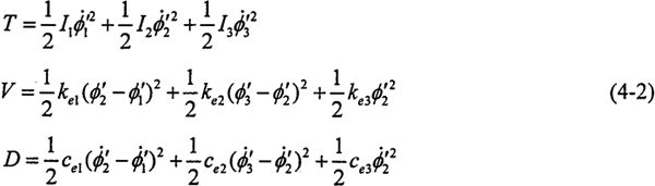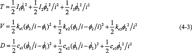 對轉(zhuǎn)換成鏈狀結(jié)構(gòu)的系統(tǒng),應(yīng)用拉格朗日法建立系統(tǒng)的扭振動(dòng)力學(xué)方程,系統(tǒng)中帶有粘性阻尼,因此列出含有耗散函數(shù)的拉格朗日方程