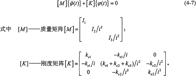 在分析和評價(jià)減速器系統(tǒng)扭振特性時(shí),需要計(jì)算系統(tǒng)的各階固有頻率以及相應(yīng)的主振型,這就要求解系統(tǒng)的無阻尼自由振動(dòng)方程。當(dāng)系統(tǒng)自由振動(dòng)時(shí),激振力矩和阻尼均為零,此時(shí)系統(tǒng)的動(dòng)力學(xué)方程可表示為