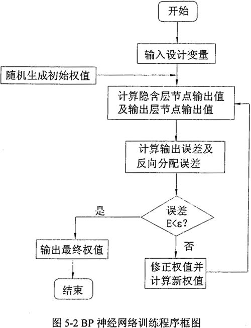 三層前饋型BP網(wǎng)絡(luò)采用BP算法來調(diào)整網(wǎng)絡(luò)連接權(quán)值和節(jié)點(diǎn)閾值。BP算法,即誤差逆?zhèn)鞑W(xué)習(xí)方法,是一種曲型的誤差修正方法。BP算法是一個種有教師的學(xué)習(xí)算法,整個網(wǎng)絡(luò)學(xué)習(xí)過程由信息的正向傳動播和誤差的反向傳播兩上階段構(gòu)成,在正向傳播的過程中,輸入信息從輸入層經(jīng)隱含層逐層處理,并傳向輸出層,如果不能在輸出層得到期望的輸出,則轉(zhuǎn)入反向傳播,運(yùn)用梯度下降法連接權(quán)關(guān)于誤差函數(shù)的導(dǎo)數(shù)沿原來的連接通路返回,通過修改各層的權(quán)值使得誤差函數(shù)減小,直到達(dá)到收斂為止。神經(jīng)網(wǎng)絡(luò)練過程如圖5-2所示。