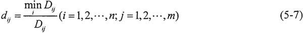 2.求轉(zhuǎn)換樣本矩陣 即象矩陣 由于指標(biāo)不同,要求不同,因此有必要按上限效果測度、下限效果測度、中心效果測度來統(tǒng)一樣本。當(dāng)指標(biāo)要求“越大越好”時,可用上限效果測度,記統(tǒng)一后的樣本為dij,則有
