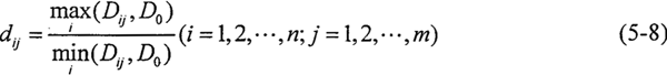 對于式(5-4),若存在x*使f1(x),f2(x),…,fm(x)全部達(dá)到最小,則稱x*為理想解。在多目標(biāo)優(yōu)化設(shè)計中,由于目標(biāo)函數(shù)間相互制約,往往得不到理想解,而滿意解也不止一個,因此定義最接近理想解的滿意解為最滿意解。應(yīng)用灰色聚類分析方法求解多目標(biāo)優(yōu)化設(shè)計中的最滿意解,具體步驟如下所示: