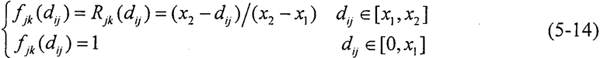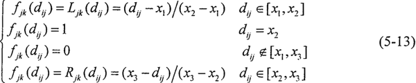 4.進(jìn)行灰色聚類 對象矩陣進(jìn)行聚類,聚類類別選為“1”、“2”、“3”三類時,其白化權(quán)函數(shù)分別與式(5-12)~(5-14)和圖5-4對應(yīng)。