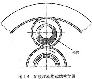 代表世界先進(jìn)水平的油膜浮動(dòng)均載裝置以其結(jié)構(gòu)緊湊、重量輕、成本低、安裝方便、減振性能好、對(duì)選用的行星輪數(shù)目不限、高低速行星傳動(dòng)均可采用、工作平穩(wěn)、均載效果好等一系列優(yōu)點(diǎn)受到國(guó)內(nèi)外許多生產(chǎn)廠家和研究機(jī)構(gòu)的重視。這是一種日本高橋崇等人發(fā)明的并取得多國(guó)專利的均載裝置,是利用厚油膜彈性作用使行星輪浮動(dòng)實(shí)現(xiàn)均載的,國(guó)外許多廠家(如日本的東洋精機(jī))已用此項(xiàng)發(fā)明生產(chǎn)了許多用于船舶蒸汽輪機(jī)、工業(yè)用齒輪減速器、甲板起重機(jī)減速器等裝置。由于該專利的關(guān)鍵技術(shù)資料十分保密,這引起許多國(guó)家探索其奧秘的興趣。這種均載方式是基于滑動(dòng)軸承理論,在行星輪與行星輪軸承(或心軸)之間裝入一中間環(huán),該環(huán)與行星輪孔之間留有徑向間隙并儲(chǔ)有潤(rùn)滑油。當(dāng)傳動(dòng)時(shí),行星輪與中間環(huán)以同一方向、同一轉(zhuǎn)速旋轉(zhuǎn),并承受方向相同的載荷,這個(gè)轉(zhuǎn)動(dòng)使它們之間形成了厚油膜實(shí)現(xiàn)行星輪浮動(dòng),厚油膜較普通滑動(dòng)軸承的油膜厚度大的多。當(dāng)行星輪間載荷分配不均衡時(shí),徑向力大時(shí)其油膜厚度相對(duì)最小,油楔夾角也隨之減小,即各行星輪對(duì)心軸產(chǎn)生不等量的位移從而實(shí)現(xiàn)均載。其原理如圖1-5所示。