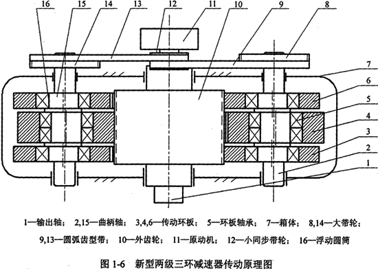 其工作原理為:小同步帶輪12隨原動(dòng)機(jī)11作高速旋轉(zhuǎn),通過(guò)嚙合,小帶輪通過(guò)平頂圓弧齒型帶9和13帶動(dòng)兩個(gè)大帶輪8和14旋轉(zhuǎn),實(shí)現(xiàn)一級(jí)減速和功率分流,兩個(gè)大帶輪分別帶動(dòng)三環(huán)減速器的雙曲柄的同步輸入,三環(huán)減速器的雙曲柄的同步輸入,三片傳動(dòng)環(huán)板3、4和6上的內(nèi)齒圈與輸出軸1上的外齒輪10相嚙合,形成大傳動(dòng)比,實(shí)現(xiàn)二級(jí)減速及動(dòng)力傳遞。三內(nèi)齒環(huán)板中的兩側(cè)環(huán)板與中間環(huán)板相差180°,且兩側(cè)各環(huán)板厚度為中間環(huán)板的1/2,這樣可保證運(yùn)轉(zhuǎn)時(shí)它們的慣性力理論上完全平衡。為克服雙曲柄機(jī)構(gòu)的死點(diǎn),一級(jí)傳動(dòng)采用同步帶傳動(dòng),增加了一級(jí)帶傳動(dòng)不僅可實(shí)現(xiàn)兩個(gè)曲柄機(jī)構(gòu)的同步輸入,同時(shí),由于同步齒形帶是彈性元件,還可實(shí)現(xiàn)兩曲柄軸載荷均載。三環(huán)減速器輪齒嚙合的均載是采用在兩曲柄軸偏心套外表面和轉(zhuǎn)臂軸承內(nèi)表面之間插入一個(gè)浮動(dòng)圓筒16,在曲柄軸旋轉(zhuǎn)時(shí),偏心套和圓筒之間、圓筒和轉(zhuǎn)臂軸承內(nèi)表面之間均形成了動(dòng)壓油膜,厚油膜的彈性變形使得內(nèi)齒環(huán)板浮動(dòng),補(bǔ)償減速器的制造和安裝誤差以及傳動(dòng)時(shí)產(chǎn)生的零部件變形。樣機(jī)的傳動(dòng)性能和振動(dòng)性能以及均載試驗(yàn)證實(shí),本文提出的完全平衡、均載減振兩級(jí)三環(huán)齒輪減速器有著較好地力學(xué)性能,較現(xiàn)有三環(huán)減速器的振動(dòng)要小、壽命要長(zhǎng)。
