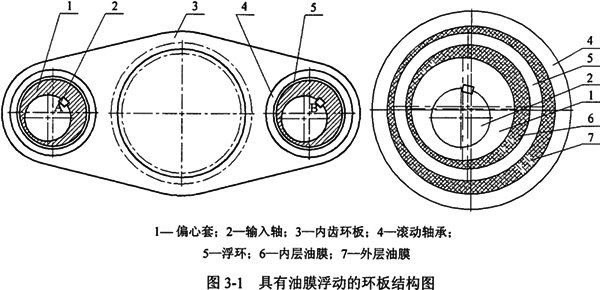 由于三環(huán)減速器充分地利用了功率分流和內(nèi)嚙合多齒接觸的原理,因此,三環(huán)減速器的承載能力較大。上一章的受力分析和振動(dòng)分析表明:采用三片內(nèi)齒環(huán)板偏心之間呈180°相位角的布置形式,能夠?qū)崿F(xiàn)慣性力和慣性力矩的完全平衡,又使得嚙合力對(duì)振動(dòng)的影響減小,采用雙軸輸入又可使三環(huán)減速器各環(huán)板所受的嚙合力相等,避免機(jī)構(gòu)的過死點(diǎn)的沖擊,改善高速軸的受力情況,提高傳動(dòng)系統(tǒng)的效率。在雙軸輸入和完全平衡狀態(tài)下,嚙合力對(duì)輸出軸支撐軸承的作用力和作用力矩也完全平衡。由于不可避免的制造和安裝誤差及動(dòng)力傳遞過程中出現(xiàn)的零部件變形,使得三片內(nèi)齒環(huán)板之間的作用載荷分配不均勻,引起動(dòng)載荷增加,導(dǎo)致振動(dòng)加劇,造成齒面點(diǎn)蝕、軸承損壞、齒輪箱發(fā)熱,甚至發(fā)生事故。本文提出的同步帶傳動(dòng)作為一級(jí)傳動(dòng)的完全平衡均載減振的三環(huán)減速器,可實(shí)現(xiàn)減速器齒輪傳動(dòng)部分的慣性力和慣性力矩完全平衡和三環(huán)傳動(dòng)的雙軸輸入,克服了死點(diǎn)位置沖擊和振動(dòng)較大的問題。該減速器的油膜浮動(dòng)實(shí)現(xiàn)了三蘇減速器均載和減振。由于本文提出的油膜浮動(dòng)方案是在旋轉(zhuǎn)的偏心軸表面與轉(zhuǎn)臂軸承之間插入一個(gè)圓柱套筒形成的,并受到一個(gè)動(dòng)載荷的作用,其動(dòng)力學(xué)研究尚未見到相關(guān)的報(bào)道,本章對(duì)油膜浮動(dòng)動(dòng)力學(xué)的有關(guān)問題進(jìn)行研究。