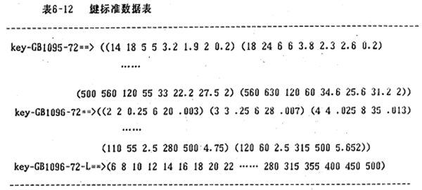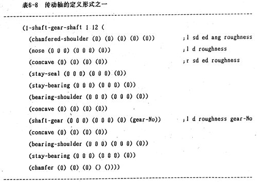 軸的結(jié)構(gòu)通常為階梯軸,階梯的級數(shù)以及各階梯的直徑和長度,應(yīng)綜合考慮軸上零件和裝配固定形式,軸的加工工藝性等因素進(jìn)行設(shè)計,階梯數(shù)以易于安裝,同時減少加工次數(shù)為主要原則。通過大量統(tǒng)計分析分類,系統(tǒng)采用七種軸的結(jié)構(gòu)形式,分別用框架表示。表6-8其中一類軸的定義形式。其中,表中主要內(nèi)容:12為段數(shù),chatnfered-shoulder、…,nose、…分別為軸段特性、尺寸、加工特性等,第九行中的shaft-gear為連軸式齒輪,最后一列的gear-No為該齒輪的編號,可以作為索引查詢到該齒輪的參數(shù)。在確定尺寸時,某類軸的形式有時會發(fā)生變化。例如,階梯軸某一段長度為零時,這一階梯軸段便在設(shè)計圖紙上消失。