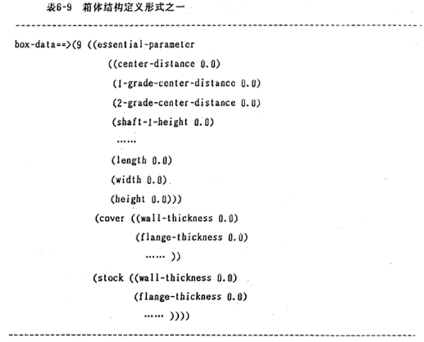 在進(jìn)行圖1-1、圖1-2-1、l-2-2、1-2-3種類的圓柱齒輪減速器設(shè)計時,箱體是種類最多,變化程度最大的部件,因此,不可能建立一種統(tǒng)一的模式。根據(jù)傳動方案的不同,箱體形狀會發(fā)生很大的變化,設(shè)計工作量極繁重。通過分析,本系統(tǒng)采用的方法是通過框架來表達(dá)箱體設(shè)計的大量知識,如表6-11所示的框架是圖1-2-2 中第9號箱體的結(jié)構(gòu)定義式。