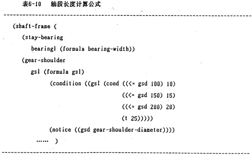 箱體結(jié)構(gòu)及尺寸設(shè)計完成后,便可進(jìn)行傳動軸結(jié)構(gòu)參數(shù)長度的設(shè)計計算。軸的各段長度,決定于軸上零件的寬度,零件間的相對位置,傳動布置,箱體尺寸以及安裝要求等。傳統(tǒng)的設(shè)計方法是根據(jù)草圖進(jìn)行設(shè)計,專家系統(tǒng)則要求精確的數(shù)值計算。軸段長度的計算是通過其知識框架和嵌套在框架中的過程知識進(jìn)行,如表6-10所示。過程知識主要用于非規(guī)律性知識的求值。在計算時,§6.8中定義的軸的結(jié)構(gòu)有時會發(fā)生變化,這主要表現(xiàn)在