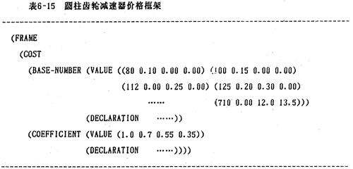1.圓柱齒輪減速器價格主要考慮齒輪材料、精度,減速器中心距,總重量等因素,如表6-14。專家系統(tǒng)設(shè)計中,可用框架表示(表6-15 ):
