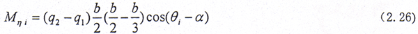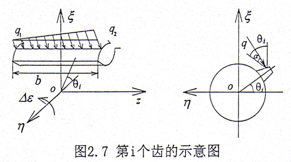 在外載荷較大時,則齒輪聯(lián)軸器內(nèi)外齒面之間接觸良好。設齒面上的載荷是線性分布,其集度分別為q1、q2,如圖2.7所示。在繞η方向給一小轉(zhuǎn)角△δ,則在第i個齒對產(chǎn)生的扭矩為Mηi。b是穩(wěn)態(tài)時內(nèi)外齒之間的有效接觸齒寬。