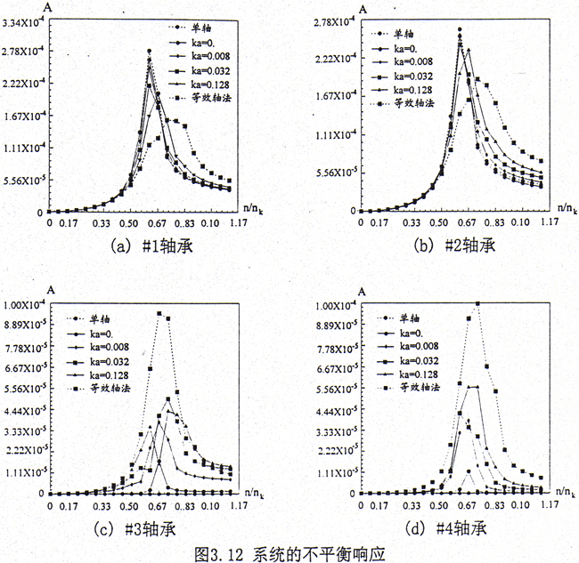 用單軸分析法計算不平衡響應(yīng),在#1和#2軸承上產(chǎn)生的振幅最大,等效軸法則最小,而在#3軸承和#4軸承上產(chǎn)生的振幅則正相反。其中用單軸分析法計算不平衡響應(yīng),在#3和#4軸承處不產(chǎn)生振動,這與實際情況不符;用等效軸法計算,則明顯夸大了二側(cè)轉(zhuǎn)子的耦合作用,沒有體現(xiàn)出齒輪聯(lián)軸器的特點。因此采用單軸分析方法和等效軸方法計算系統(tǒng)的不平衡響應(yīng)均存在不小的誤差。通過上面的計算可見,隨著轉(zhuǎn)角剛度的增大,左側(cè)轉(zhuǎn)子的不平衡量對本身轉(zhuǎn)子支承軸承所激起的響應(yīng)幅值明顯減小,對右側(cè)轉(zhuǎn)子支承軸承所激起的響應(yīng)幅值則明顯增大。