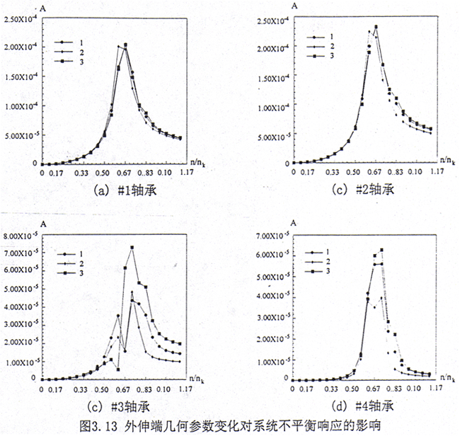 從上面的計算可見,在給定的條件下,轉(zhuǎn)子外伸端的幾何參數(shù)對在#1、#2軸承處的不平衡響應(yīng)影響不大;對#3、#4軸承處的不平衡響應(yīng)有影響,但量級較小,因此可以認為外伸端的幾何尺寸對系統(tǒng)的不平衡響應(yīng)影響較小。