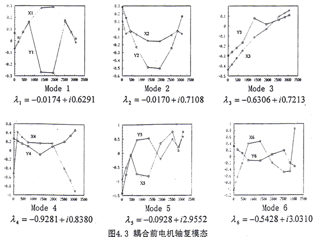 通過齒輪聯(lián)軸器耦合后的轉(zhuǎn)子系統(tǒng),在上述給定的轉(zhuǎn)速范圍內(nèi),共為12階模態(tài),如圖4.4所示,比耦合前多了2階。這表明耦合后在上述轉(zhuǎn)速范圍內(nèi)模態(tài)數(shù)目發(fā)生了變化。耦合系統(tǒng)的模態(tài)可以分為兩類:(1)第一類為耦合成分很小的振動,例如Mode1、Mode4、Mode7、Mode8,這4階幾乎完全表現(xiàn)為G軸的振動,電機軸的振動很小。但是從模態(tài)圖上來看又不能與耦合前單個G軸的4階模態(tài)相對應(yīng),主要表現(xiàn)為與齒輪聯(lián)軸器相連接的G軸的外伸端在耦合前上述4階的振動很大,而在耦合后振動受到很大的抑制,振動很小。從復(fù)特征值來看,無論是反應(yīng)系統(tǒng)衰減快慢的實部,還是反映系統(tǒng)自然振動頻率的虛部都有不小的變化。如果將上述4階對應(yīng)的復(fù)特征值作一比較,那么其中耦合后的虛部值總是大于耦合前的對應(yīng)值。其主要原因是在耦合后將G軸和電機軸作為一個整體系統(tǒng)來考慮,此時相當(dāng)于將電機軸看作是對G的一個約束,這一約束直接作用于外伸端,使得G軸外伸端的振動減小,同時使得G軸的自然頻率增大。因此傳統(tǒng)上在計算DH機組的動態(tài)特性時,強行將G軸和電機軸分開,而只考慮其中的G軸,僅從這4階模態(tài)和復(fù)特征值上進行分析也會產(chǎn)生較大的偏差。(2)第二類為G軸和電機軸之間的耦合模態(tài),在這8階模態(tài)中G軸和電機軸的振動非常明顯,這表明如果將G軸和電機軸在齒輪聯(lián)軸器處分開處理,僅計算G軸的振動,而不考慮電機軸的影響,那么上述8階模態(tài)會全部被漏掉,因此這樣處理會丟失一些非常重要的低頻信息。在文獻[18]中,由于未考慮電機軸的作用,因此與電機軸有關(guān)的模態(tài)信息就不出現(xiàn)。如果從這8階復(fù)特征值前6階的數(shù)值來看,那么都能從耦合前電機軸的6階模態(tài)中找到,而且低階特征值的實部和虛部變化均不大。這說明如果僅分析電機軸的振動,那么將G軸忽略掉,倒能得到較好的近似。從直觀上看,將G軸與電機軸相比,其質(zhì)量和幾何參數(shù)要小許多。如果將G軸看成是電機軸的約束,那么這一約束比電機軸對G軸的約束自然要弱得多。因此從這一意義上來說G軸對電機軸的影響沒有電機軸對G軸的影響大。綜上所述,耦合后電機軸對G軸的影響較大,而G軸對電機軸的影響較小。在實際工程中,象DH這樣的機組曾發(fā)生電機振動過大的現(xiàn)象[9],因此如果不將G軸、電機軸和齒輪聯(lián)軸器作為整體一起進行分析而在齒輪聯(lián)軸器處強行分開只分析G軸的振動就顯得極不合適。