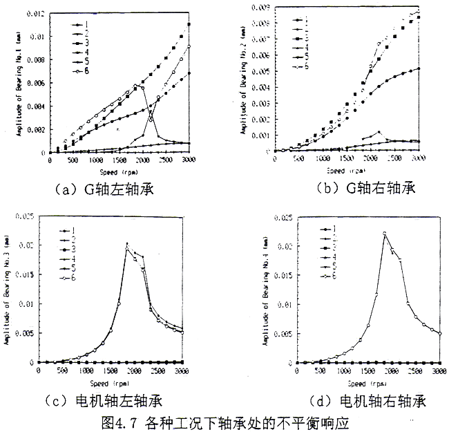 軸承處振幅的大小是直接反應(yīng)機(jī)組平穩(wěn)運(yùn)行的情況,所以在此列出了處種工況下4個(gè)軸承處的振幅。結(jié)果如圖4.7a~4.7d。圖中標(biāo)號(hào)的意義為:1—單個(gè)G軸上作用不平衡力;2—單個(gè)電機(jī)軸上作用不平衡力;3—耦合系統(tǒng)G軸上作用不平衡力;4—耦合系統(tǒng)在聯(lián)軸器上作用不平衡力;5—耦合系統(tǒng)在電機(jī)軸上作用不平衡力;6—耦合系統(tǒng)在3處同時(shí)作用不平衡力。