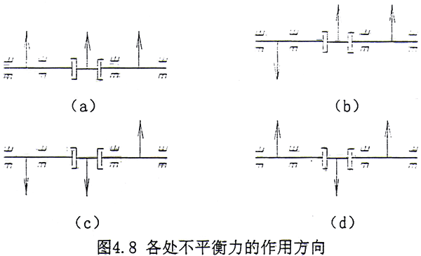 在實(shí)際系統(tǒng)中,不平衡力的作用方向是無法預(yù)知的,不妨設(shè)系統(tǒng)不平衡力的作用方向分別如圖4.8a~4.8d所示。各處不平衡量同上。計(jì)算了在3處同時(shí)具有不平衡力,耦合系統(tǒng)的不平衡響應(yīng)。結(jié)果見圖4.9a~4.9d。從中可以看出,不平衡力作用方向的不同對(duì)G軸兩側(cè)的支承軸承有一定的影響,但影響不大,對(duì)電機(jī)軸兩側(cè)的支承軸承則幾乎沒有任何影響。