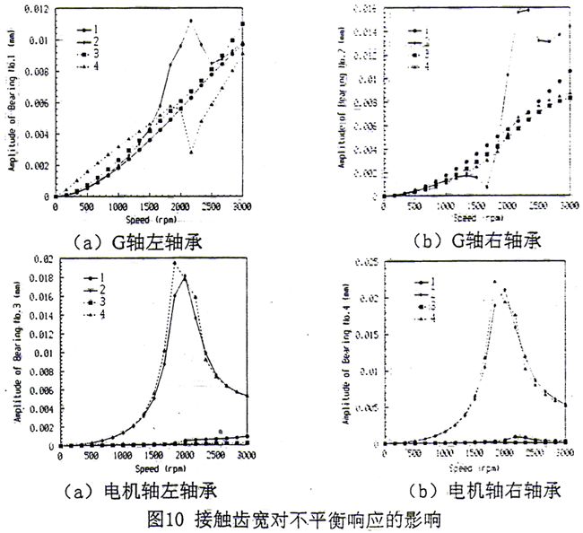 圖4.10a~4.10d表示了接觸齒寬對(duì)不平衡響應(yīng)的影響。圖中符號(hào):1—耦合系統(tǒng)在3處同時(shí)作用不平衡力(全齒寬接觸),2—耦合系統(tǒng)在G軸上作用不平衡力(全齒寬接觸),3—耦合系統(tǒng)在3處同時(shí)作用不平衡力(接觸齒寬為小量),4—耦合系統(tǒng)在G軸上作用不平衡力(接觸齒寬為小量)。從圖中可見,在非共振區(qū)接觸齒寬b對(duì)G軸上靠近聯(lián)軸器的右軸承影響較大,對(duì)其它軸承的振動(dòng)影響要小得多。這實(shí)際上反應(yīng)了電機(jī)軸對(duì)G軸耦合程度的增加。