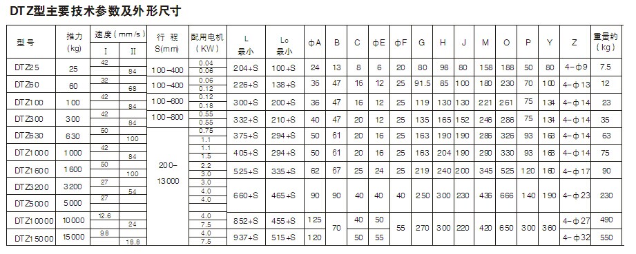 DT系列電動推桿是一種將電能轉(zhuǎn)換成往復(fù)運動機械能的通用機械手,適用于各種復(fù)雜或簡單的工藝流程,具有結(jié)構(gòu)緊湊,安裝方便,使用可靠,維修簡單,節(jié)約能源等優(yōu)點。與液壓氣動系統(tǒng)相比,不但省掉了繁雜的系統(tǒng)和減輕了重量,而且不受氣候及環(huán)境的限制,可實現(xiàn)遠距離集中或自動控制,廣泛應(yīng)用于冶金、礦山、電力、煤炭、交通、糧食、化工、建材等部門。 二、電動推桿結(jié)構(gòu)與性能: 1、結(jié)構(gòu): 電動推桿由電動機、減速齒輪、絲桿、銅螺母、導(dǎo)向套、活塞桿、軸承座、軸承座、彈簧、缸筒座、聯(lián)接叉及光電接近開關(guān)裝置(用戶選購)等部件所組成。 2、工作原理: 電動機通過一級或二級齒輪減速后,帶動絲杠螺母付,把電動機的旋轉(zhuǎn)運動變?yōu)橹本運動,利 用電動機正反轉(zhuǎn)實現(xiàn)推桿往復(fù)動作。輸出推拉力相等。通過各種杠桿力臂長度,可以增長行程。 3、過載自動保護功能: 電動推桿內(nèi)過載自動保護裝置,當推桿行程到極限位置或負載超過額定推力一定數(shù)值時,推桿 將自動切斷電源,起到保護作用,使電動機及其它構(gòu)件不致?lián)p壞,但不得以此作為正常運行時的限 位開關(guān)使用。因此要求在本機上另行配置外行程限位開關(guān)裝置,本廠可為用戶配置光電接近開關(guān)裝 置,以控制推桿正常起停。 一、原理和功能