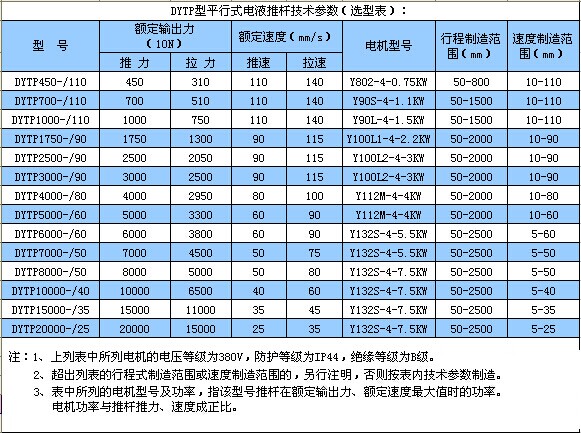 除上述三種調(diào)節(jié)功能定貨時必須文字注明外,其他請參照型號編制方式,認真填寫六大要素。 DYTP型平行式電液推桿技術(shù)參數(shù)(選型表)