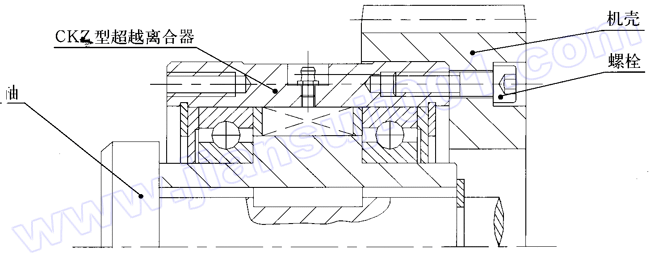 CKZ型為有軸承支撐的楔塊超越離合器。適用于極限轉(zhuǎn)速為600~1500r/min,常用公稱轉(zhuǎn)矩為:180~8000N·m,常用于包裝機(jī)、起重運(yùn)輸機(jī)械、冶金機(jī)械、礦山機(jī)械、石油機(jī)械、化工機(jī)械、水泥機(jī)械、電站等,亦稱逆止器。此型號(hào)主要用于逆轉(zhuǎn)及雙動(dòng)力源的慢速啟動(dòng)裝置。